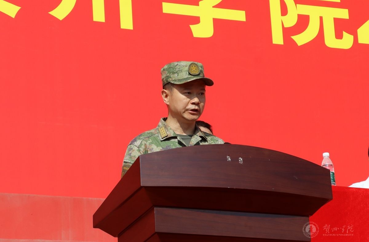 蒲毅大校作动员讲话。他希望全体参训新生能在军训中刻苦磨砺,锤炼坚强意志,强化责任担当,将国防意识和军人作风内化于心、外化于行,以实际行动展现新时代青年的使命感与责任感。